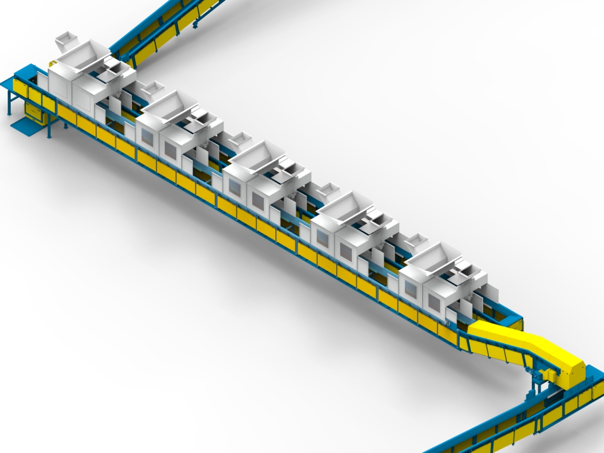 - 1 transportador bajo prensa con material compartido y ciclo de limpieza mediante soplado. Selector que reparte el material a 2 transportadores de material independiente.